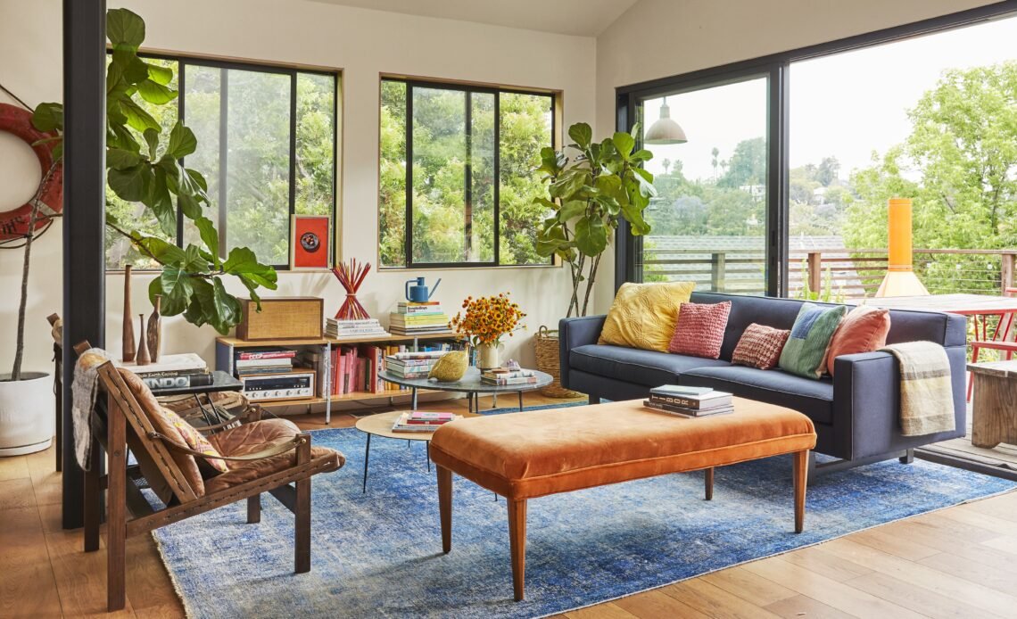 A flexible living room isn’t one where everything’s heavy and hard to move. Incorporate lighter accent chairs, nesting tables, poufs, and stools that can easily be picked up, swapped, or stored when not in use.